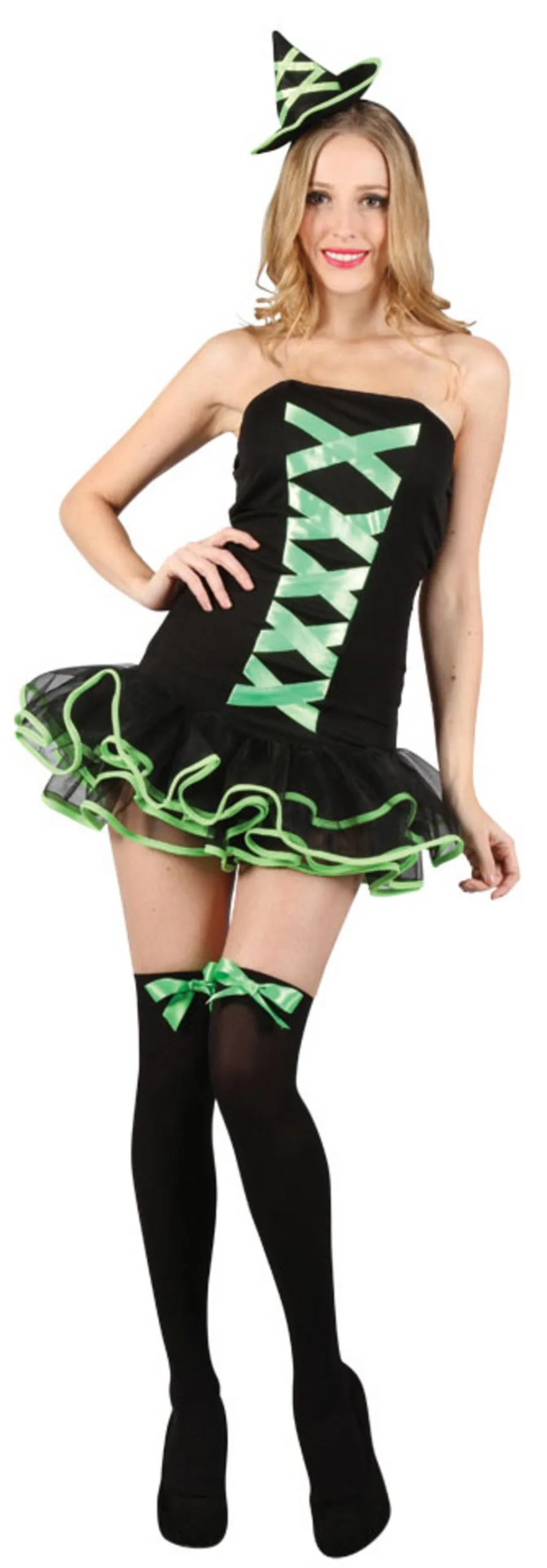 dress costume. The witch costume features a short black strapless dress